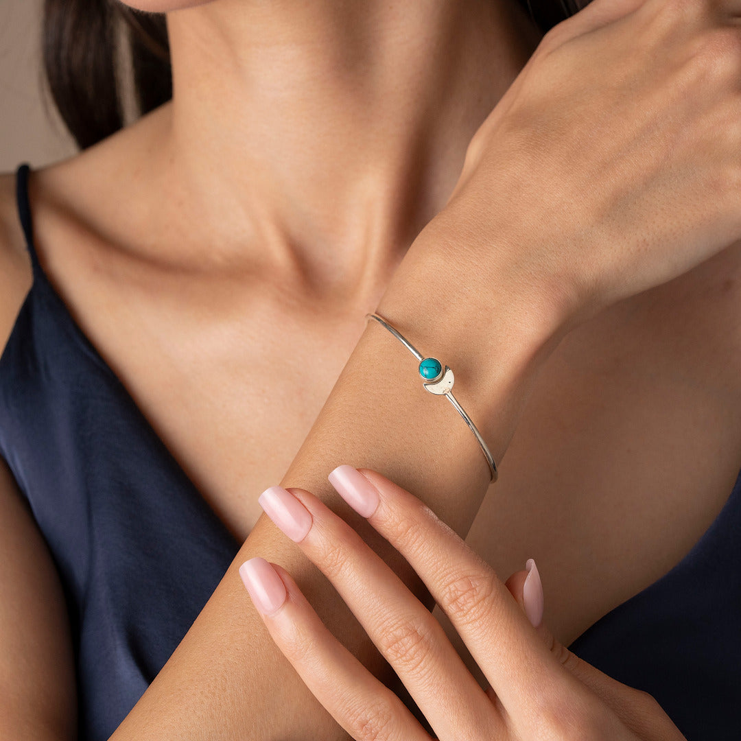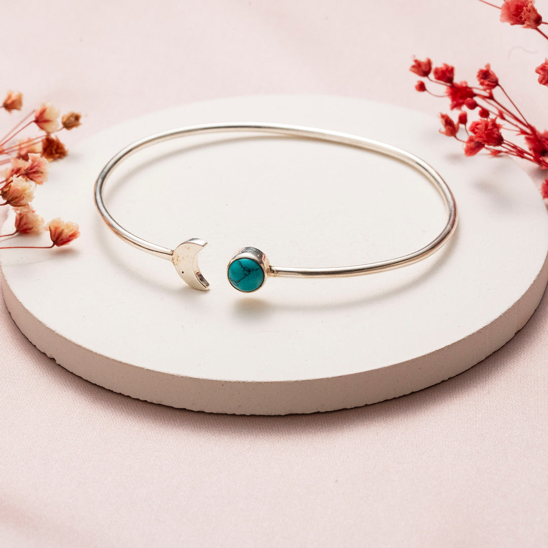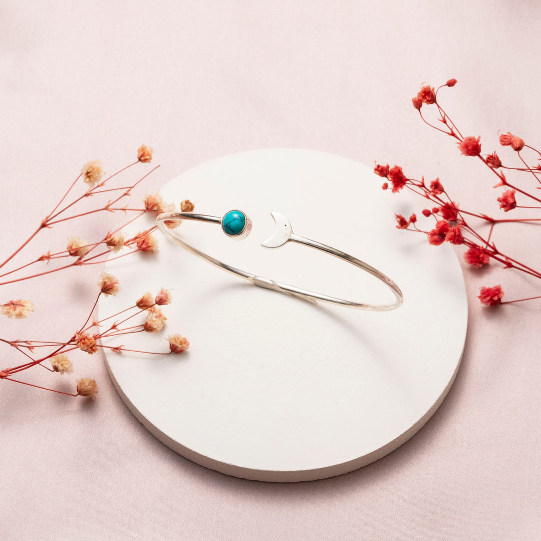 Yüksek kaliteli 925 ayar gümüşten üretilmiş ve gerçek İran firuze taşıyla süslenmiş bu zarif bileklik, minimal ama anlamlı tarzıyla öne çıkar.